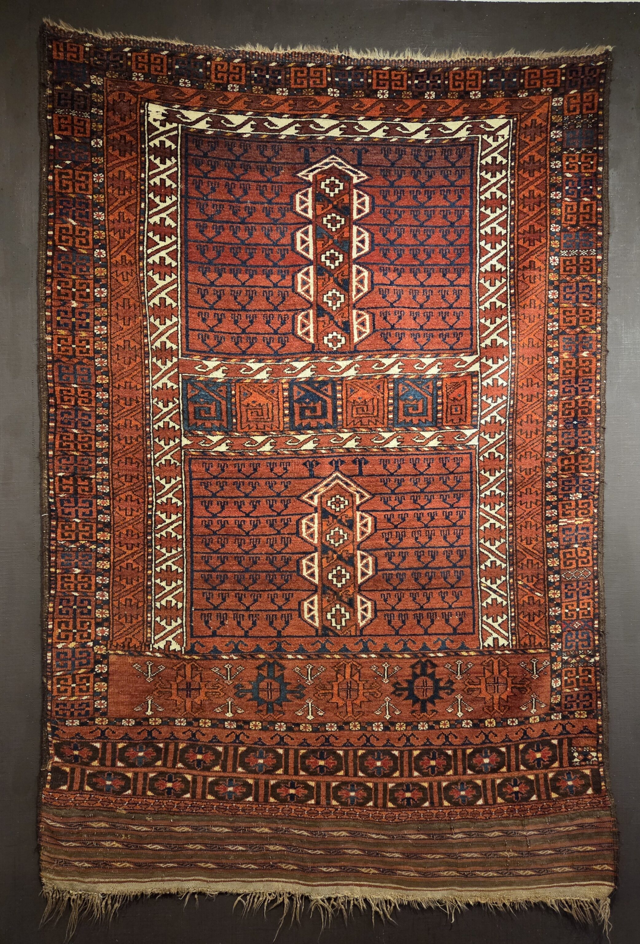 It follows the classic format of these door rugs, with four central panels being separated by a large horizontal bar and two vertical bars with a cruciform centre to the diamonds in the middle. They both end in three hook designs at the top.