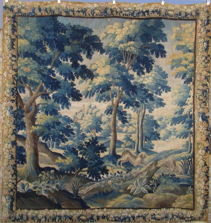 This large Flemish Verdure Tapestry panel is dating to about 1700. It is depicting an idyllic rural scene typical of this genre. Two elegantly drawn dogs are heading for a stream, a building is just visible behind a tree off centre. The composition, including the generously drawn and well spaced trees, and the fresh colours, mainly in tones of blue, green and brown-grey, create an elegant and serene textile.