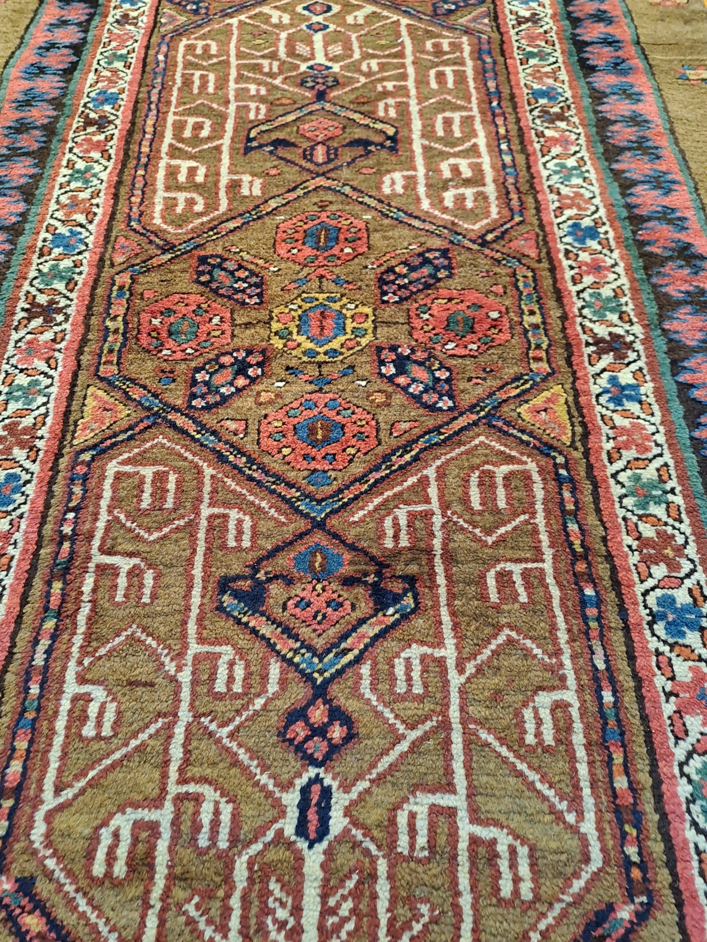 “The better grades were woven in Sarab itself and in the nearby villages, and are called in Tabriz after the town of Sarab. The best woven and the most prized among them have grounds of a lovely shade of camel, with copper-red lozenge-shaped medallions.” (op.cit., p.67) He goes on to say that most weaving in this area was concentrated on the production of runners and had almost completely ceased when he visited in 1948. Edwards speculates that the main reason for this decline was the fact that runners were a lot less profitable for the weavers than large carpets like Heriz carpets, say. He quotes square-metre prices achieved in the Tabriz bazaar as twice the amount for a Heriz carpet compared to a Sarab runner, so a perfectly reasonable assumption.
